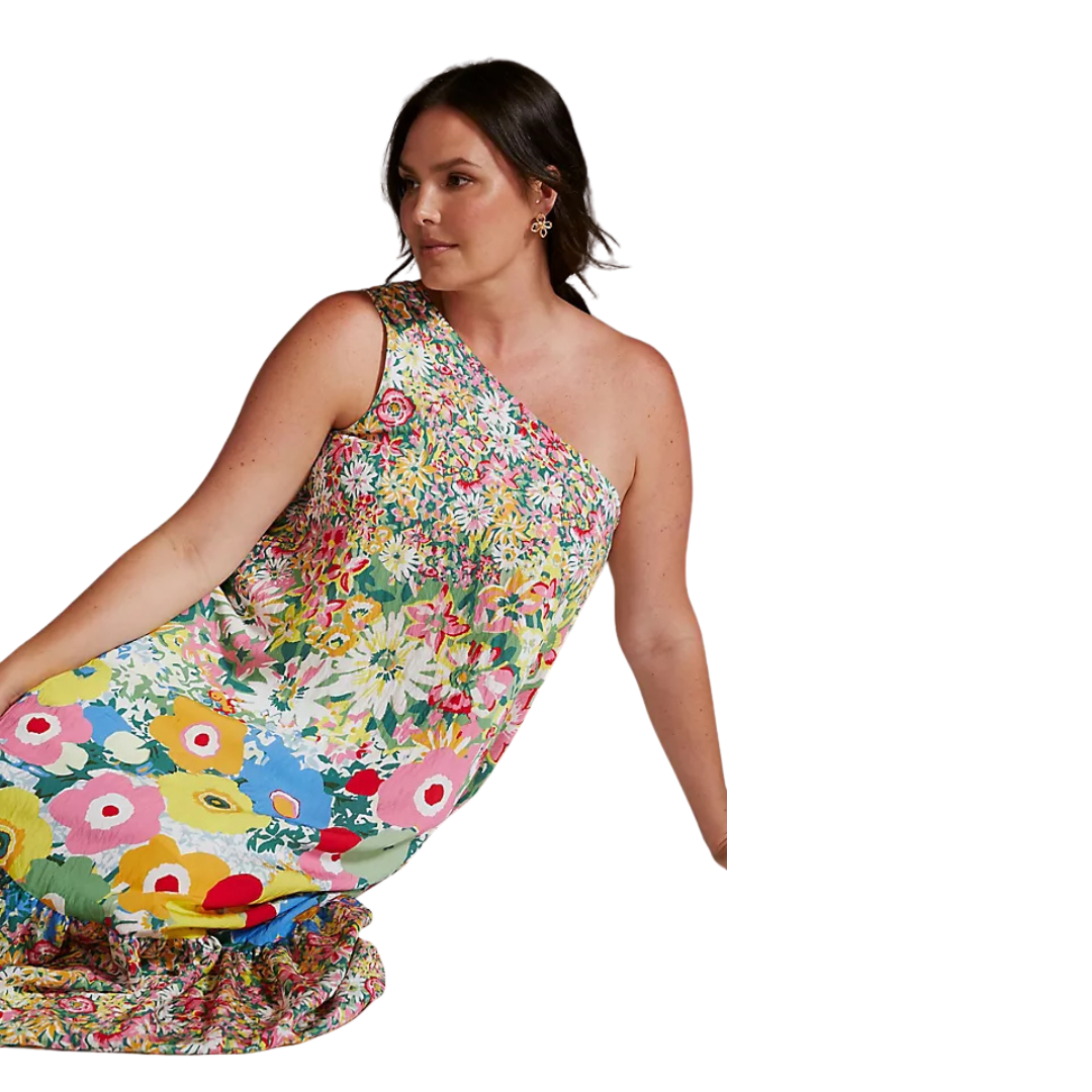 Sarah Campbell for Anthropologie Floral One Shoulder Midi Dress in size 3X. The dress is a loose, flowy silhouette with a ruffle hem. The material is non stretch.