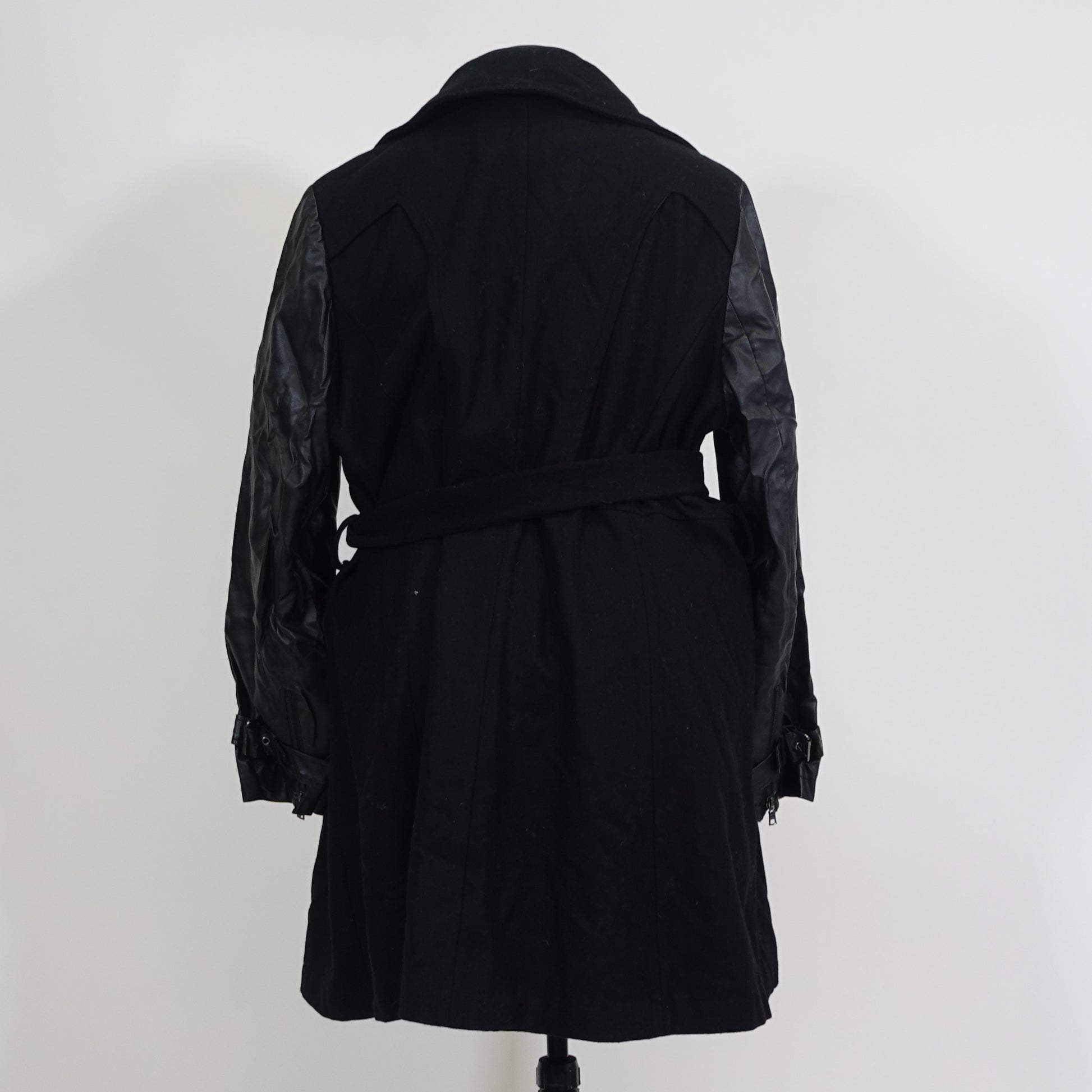 Black Zip Up Trench Coat with Faux Leather Sleeves from Giacca Woman in size 3X. The coat has a matching tie belt and there are buckle details on the sleeve cuffs. The material is non-stretch.