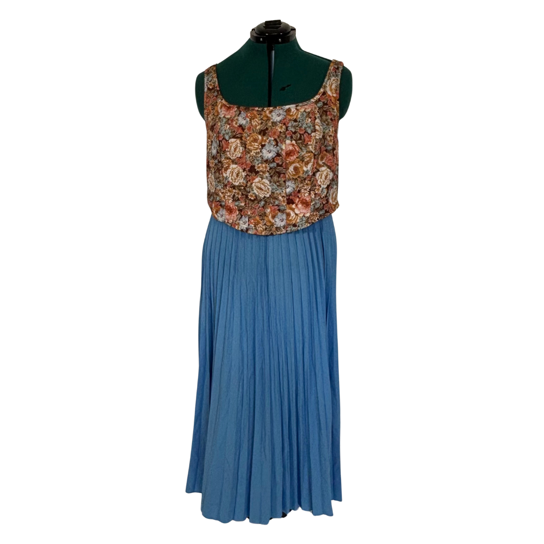 Blue Pleated Midi Skirt. There is no size or brand tag but it would best fit a size 2X, see below for exact measurements. The pleated material is non-stretch and has a flat elastic waist.