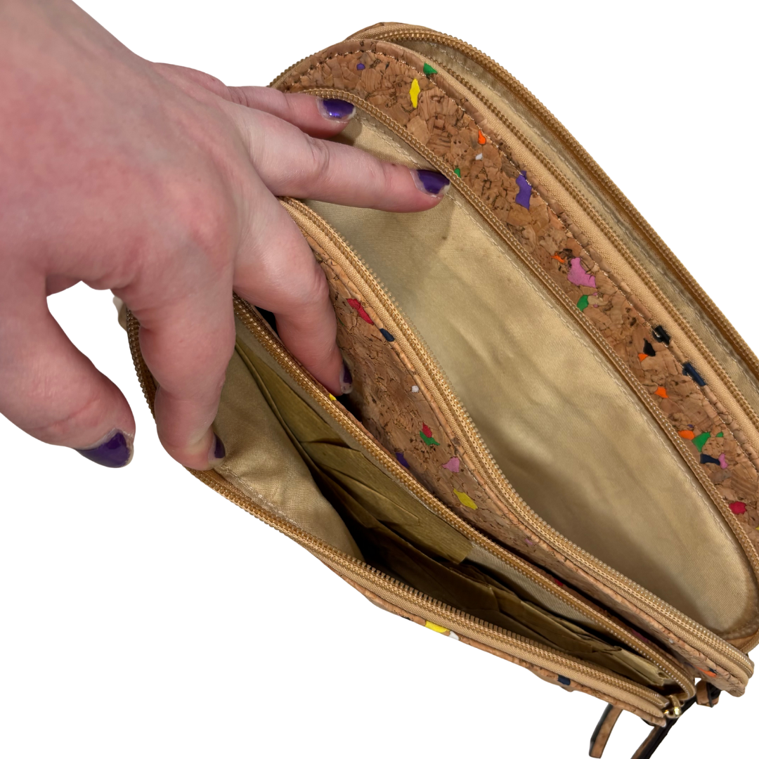 Cork Purse with Rainbow Speckles NWOT. The purse has three large zippered pockets as well as a magnetic clasp pocket. It comes with a short gold chain hand strap as well as a longer crossbody strap.
