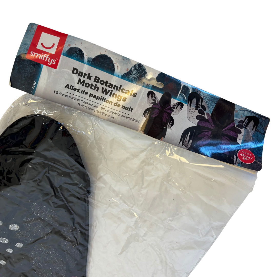 Dark Purple/ Black Moth Wings NWT from Smiffy’s SMIFFYS dark botanical moth wings. They are purple, black, and silver and measure approximately 26”.
