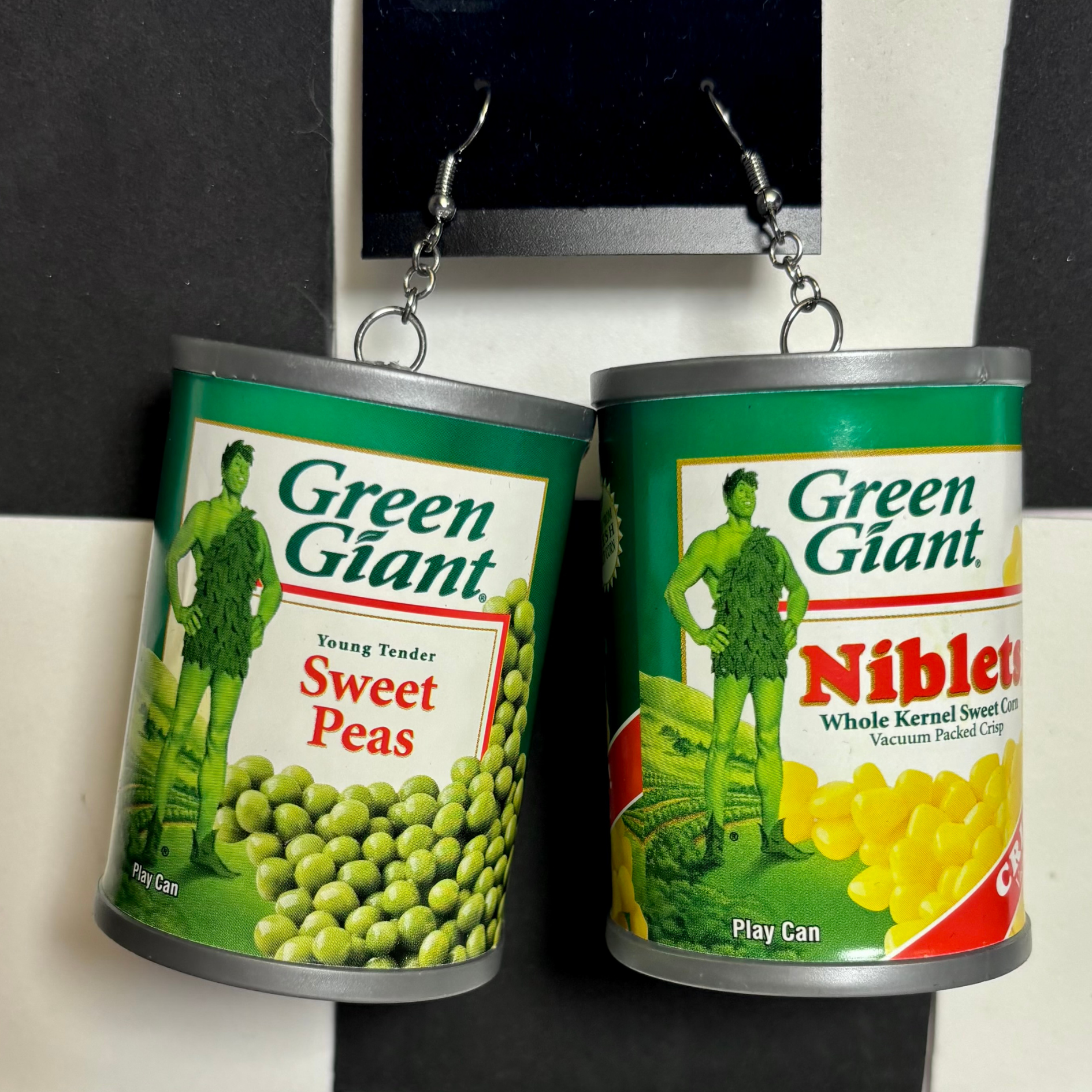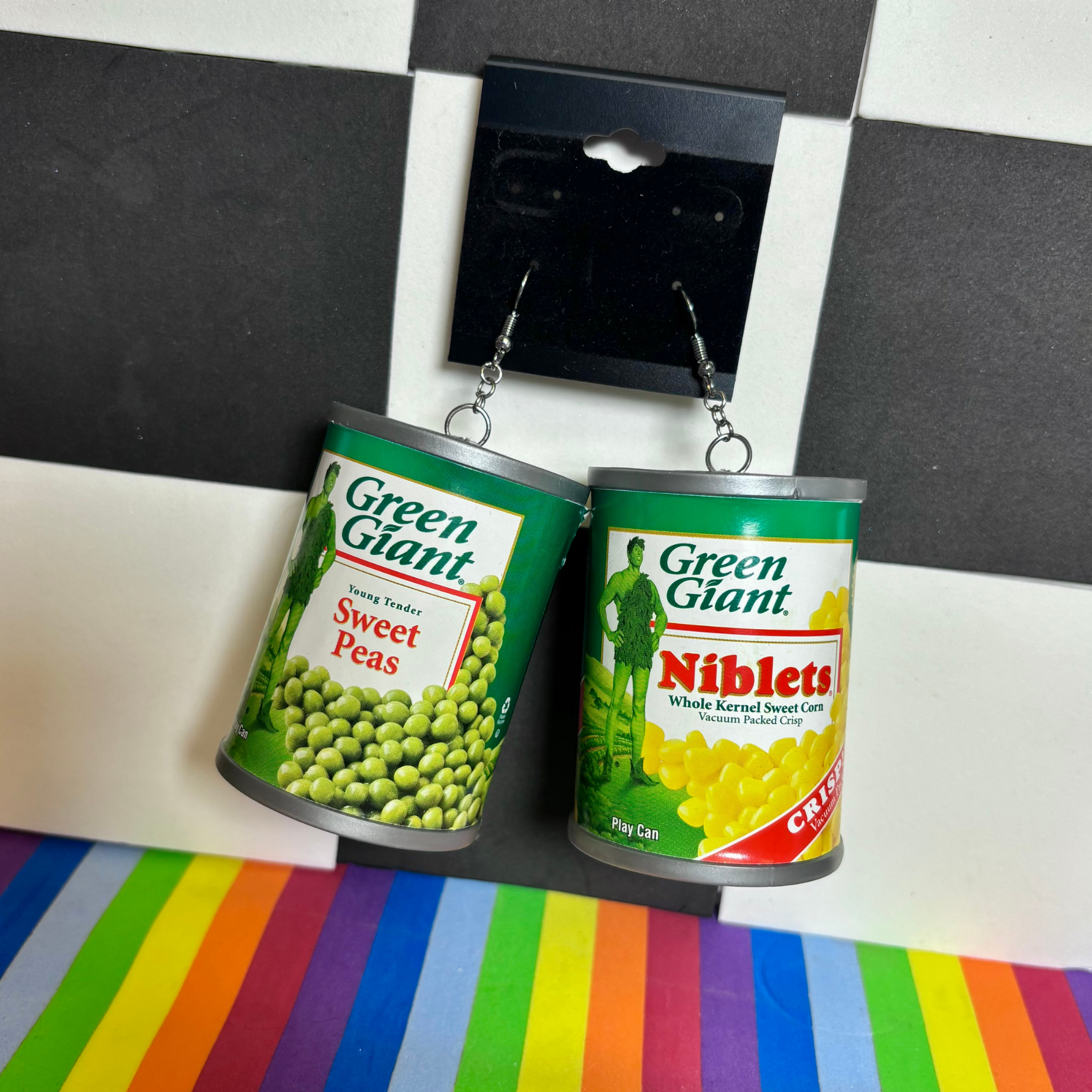 The Eat Your Veggies Earrings are made from Green Giant kids play food cans of veggies. They are made of a lightweight hollow plastic and measure about 3.5".