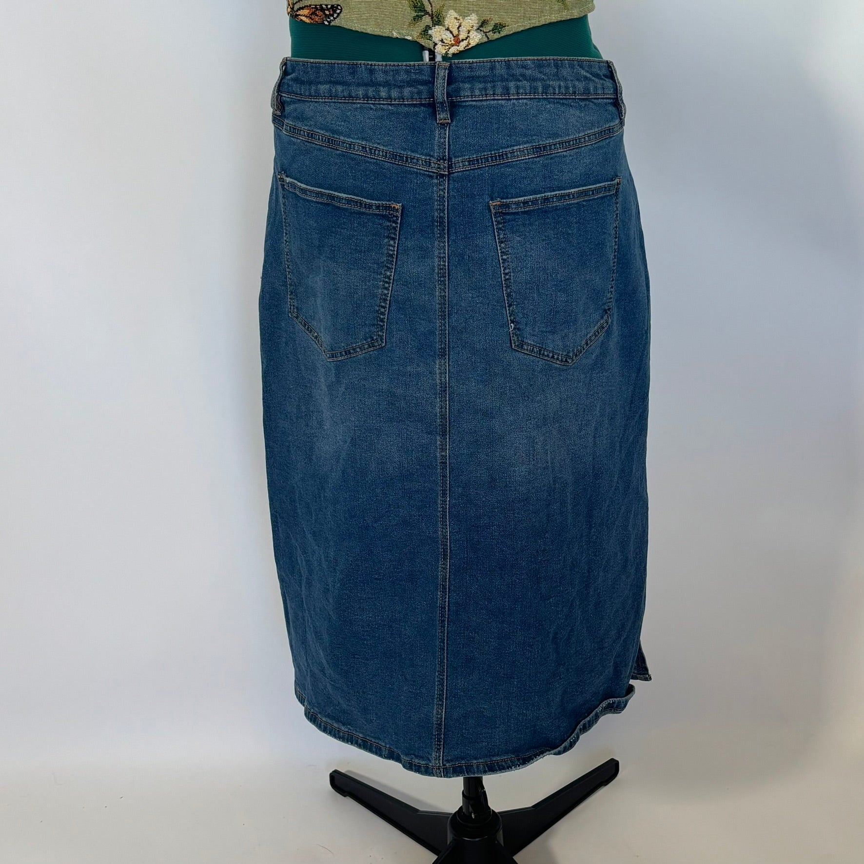 Eloquii Denim Midi with Side Slits in size 22. The skirt is a medium wash high stretch denim.