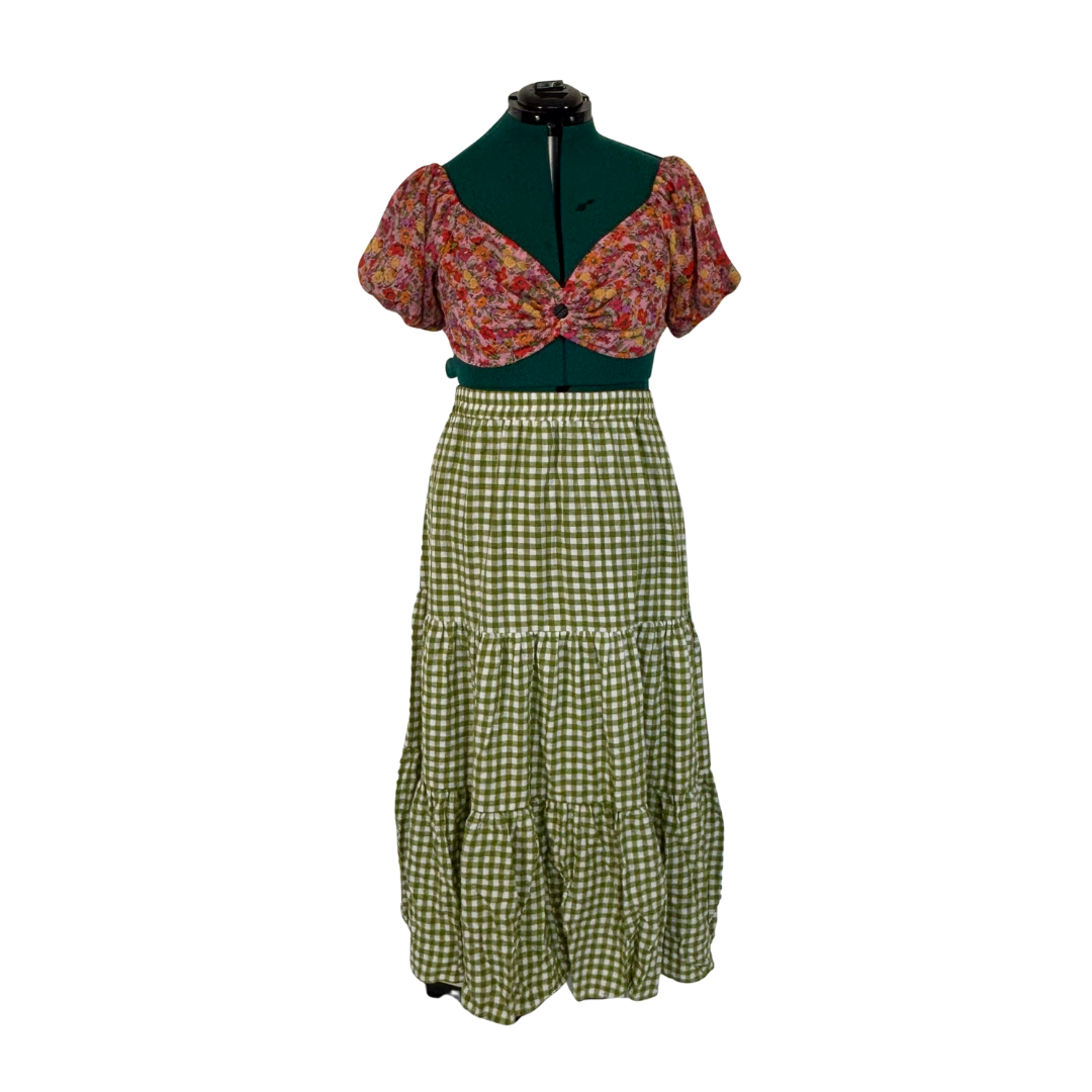 Green and White Gingham Tiered Maxi Skirt