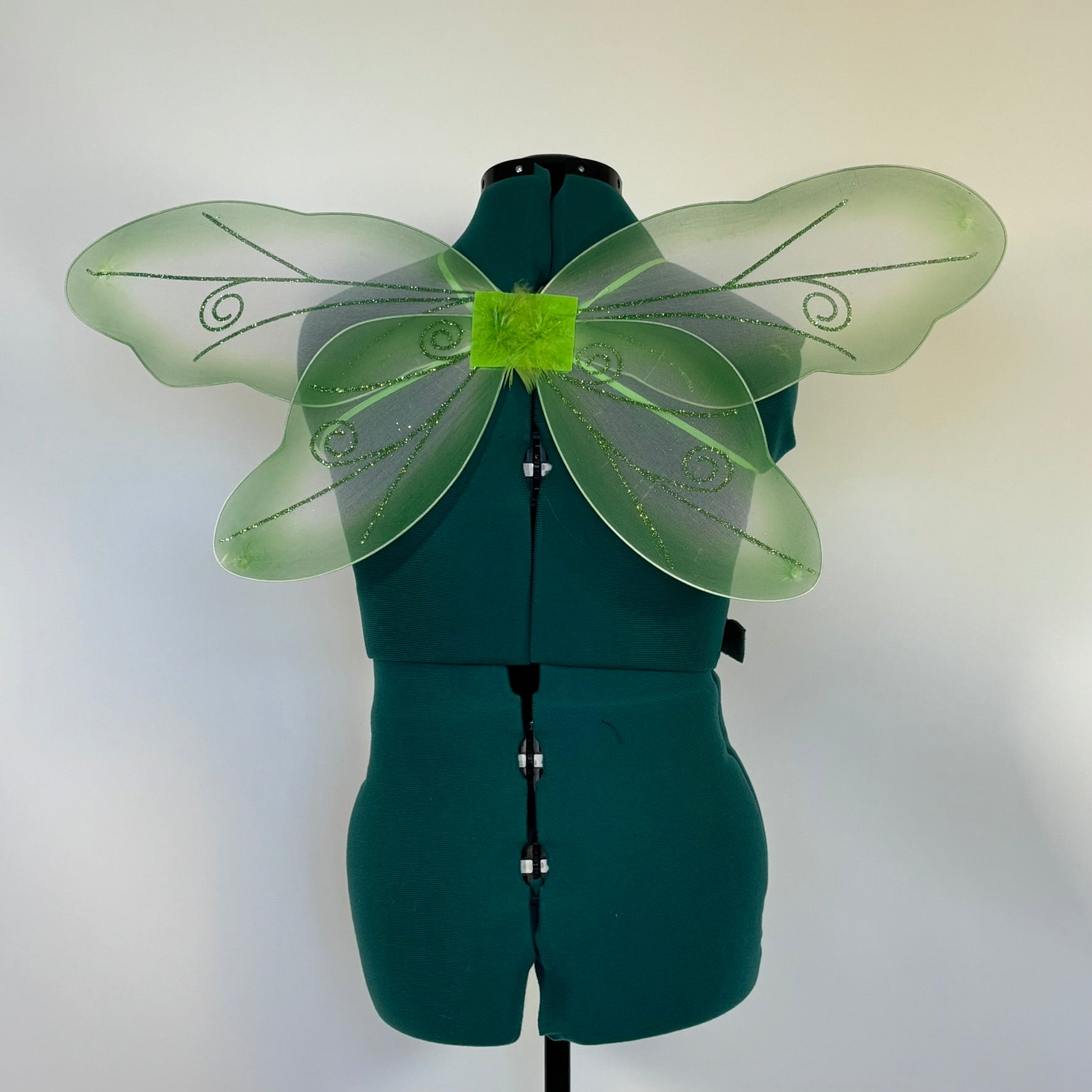 Green Fairy Wings. The wings are stretch nylon with a wire frame, elastic straps, and a small feather area.