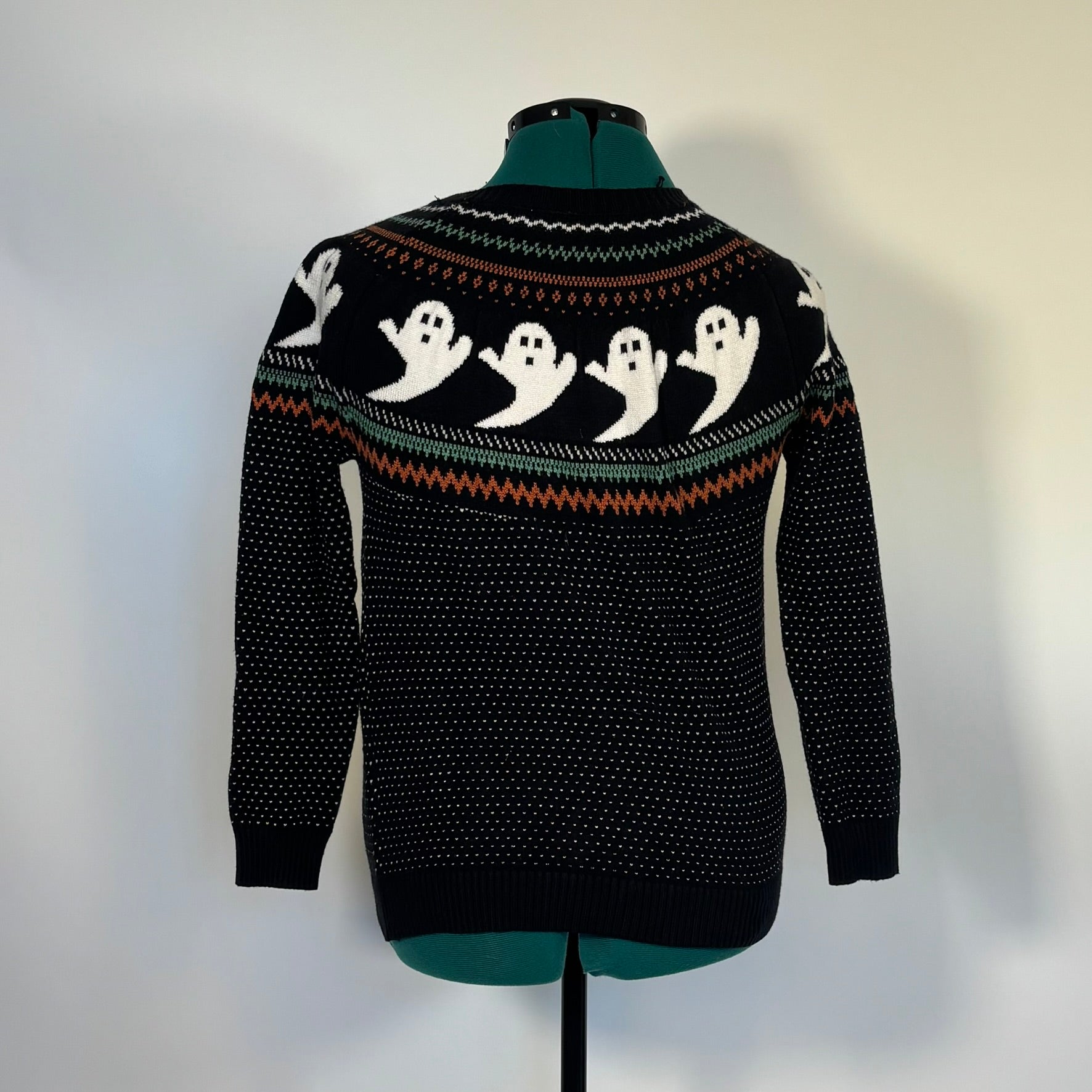 Halloween Knit Sweater. There is no size tag but it would best fit a size Large and the chest measures 19.5” laid flat. The material has a medium amount of stretch.
