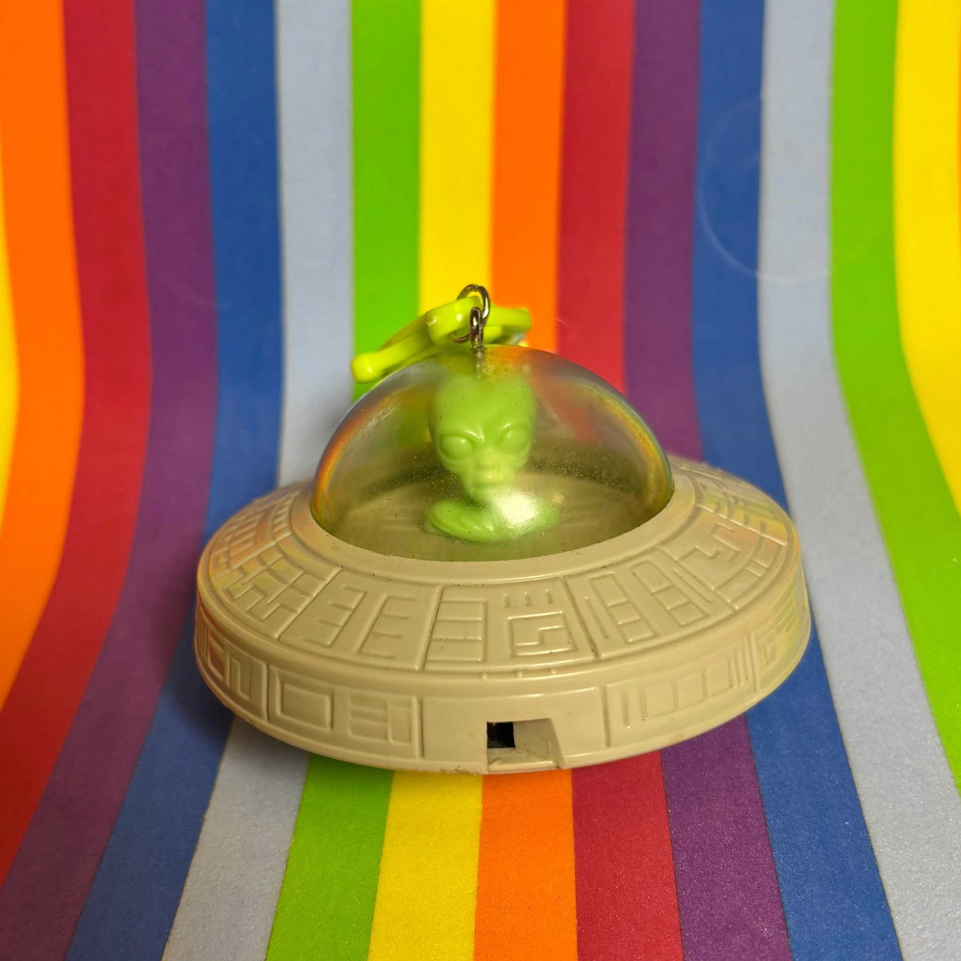 Men in Black Alien Bag Charm is made from a 1998 Burger King X Men in Black kids meal toy. It features a small green alien flying his UFO. It is medium weight and measures about 3-3.5" when hanging.