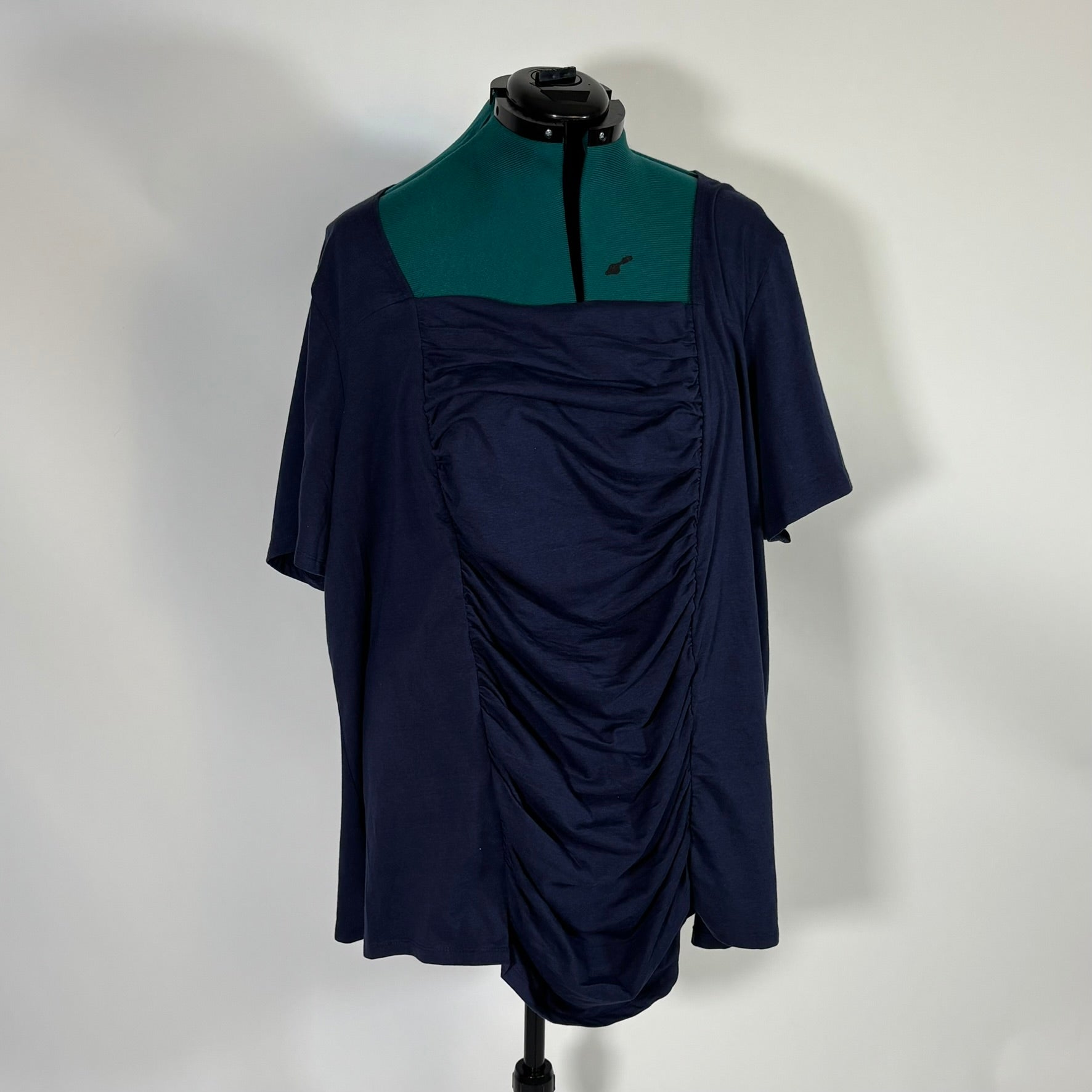 Navy Short Sleeve Square Neck Top with Ruching Detail from Roaman’s in size 6X. The top is made of a high stretch material.