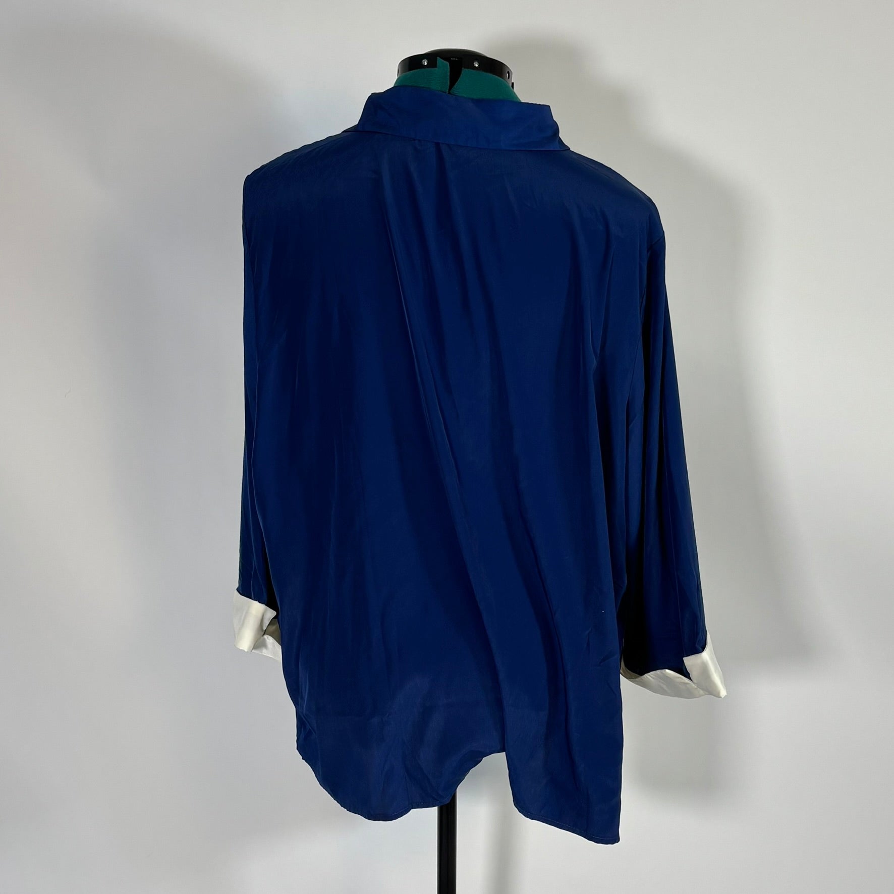 Navy Silky Button Down with White Pussybow and Sleeve Cuffs from Myrtlewood in size 4X. The material is non stretch.