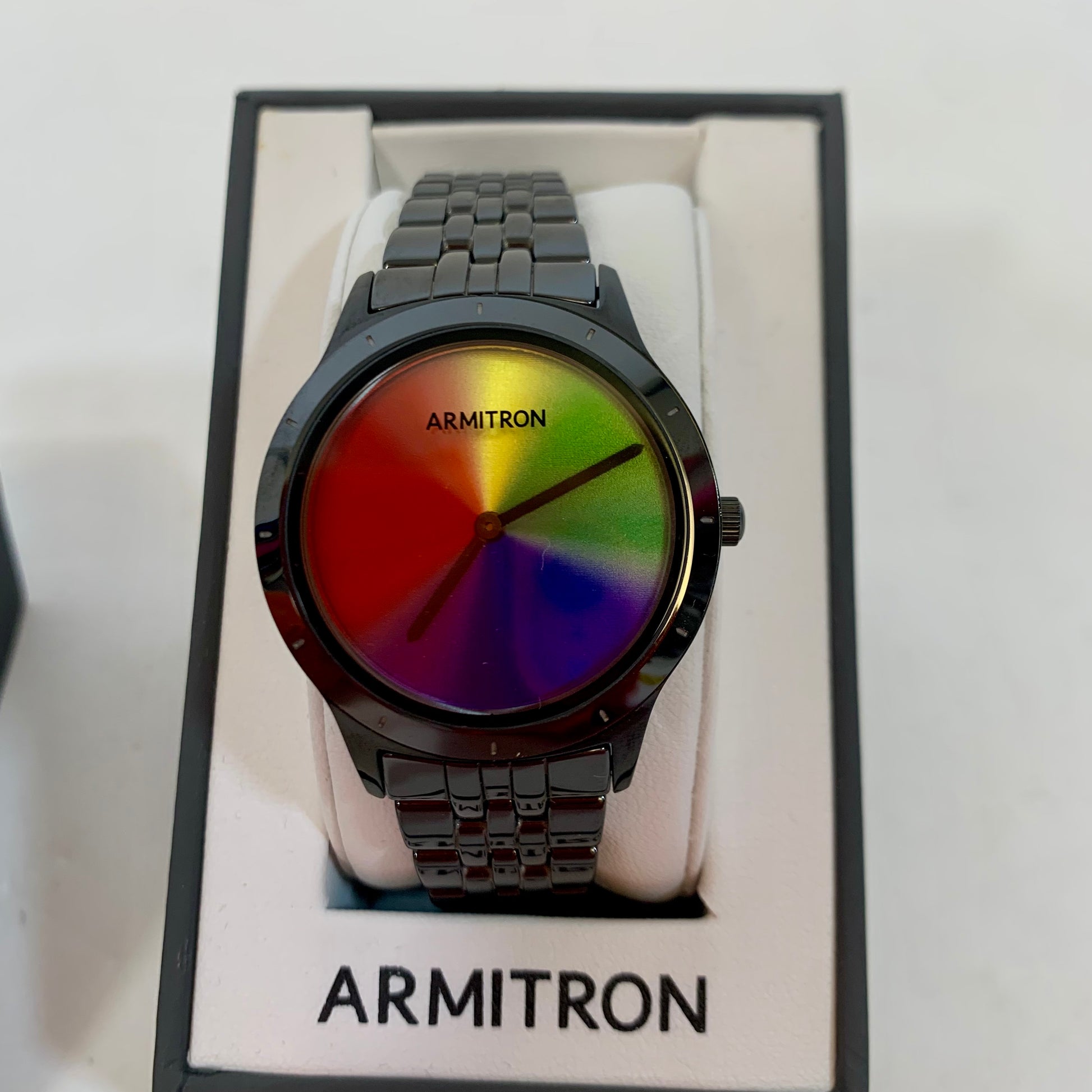 New in Box Armitron Prismatica 36mm Black Ceramic/Rainbow Watch measures 8.5" at its longest connector link