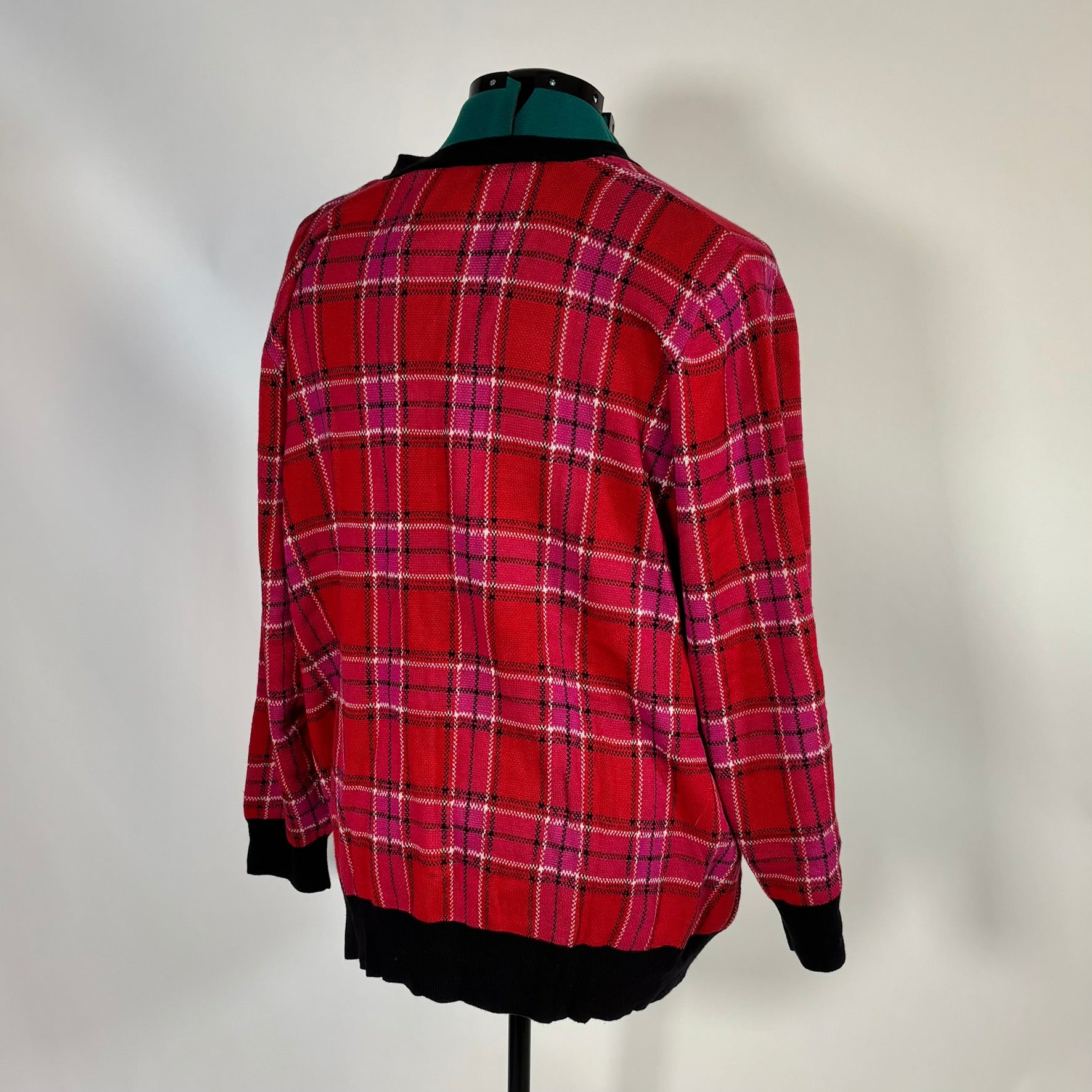 Red and Pink Plaid Cardigan with Gold Hardware NWT from Jessica London available in a size 18/20 and a 26/28. The material is a medium stretch knit and it has domed gold buttons.