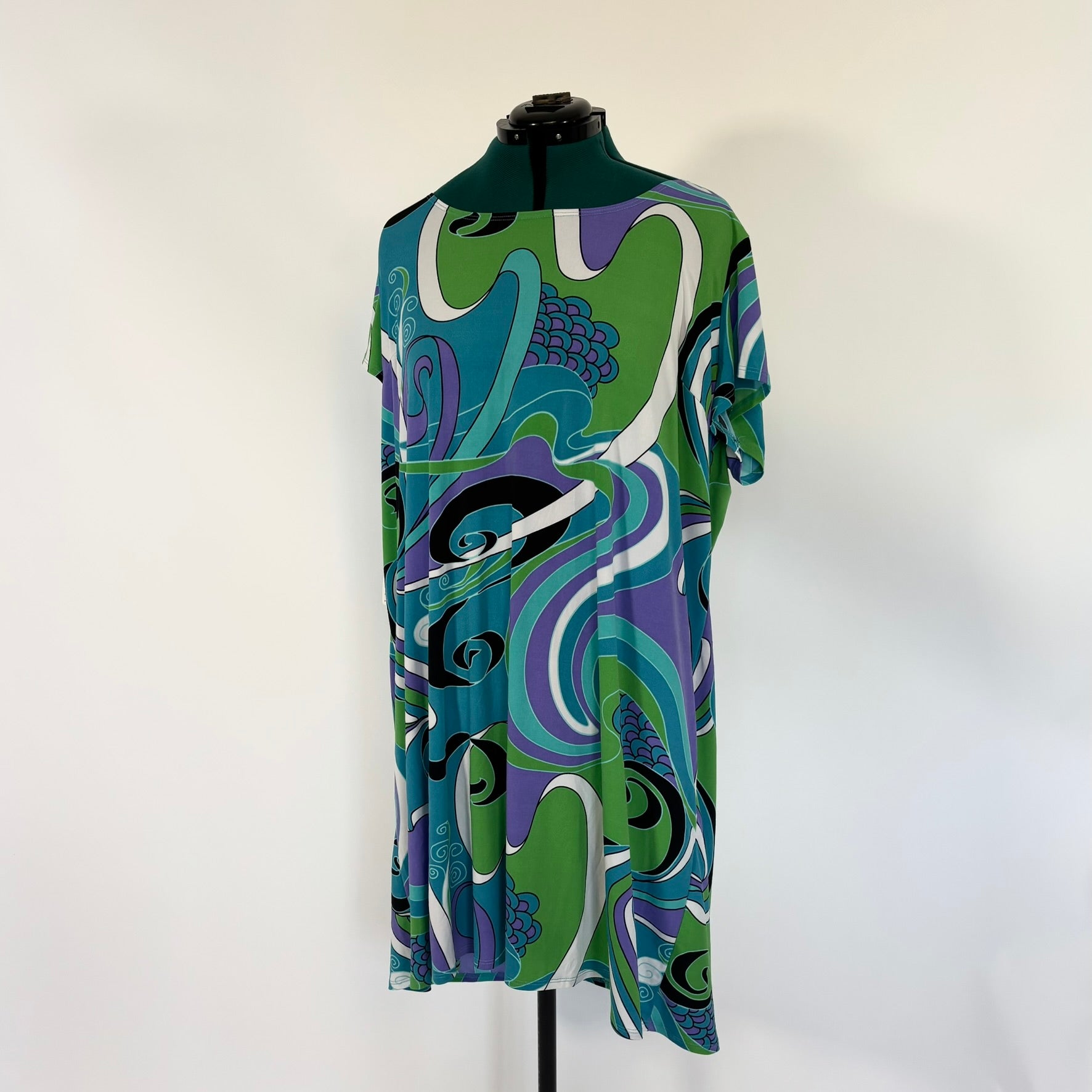 Vintage 70s Print Swing Dress from TIana B in size 3X. The dress is made of a slinky, lightweight, high stretch material.