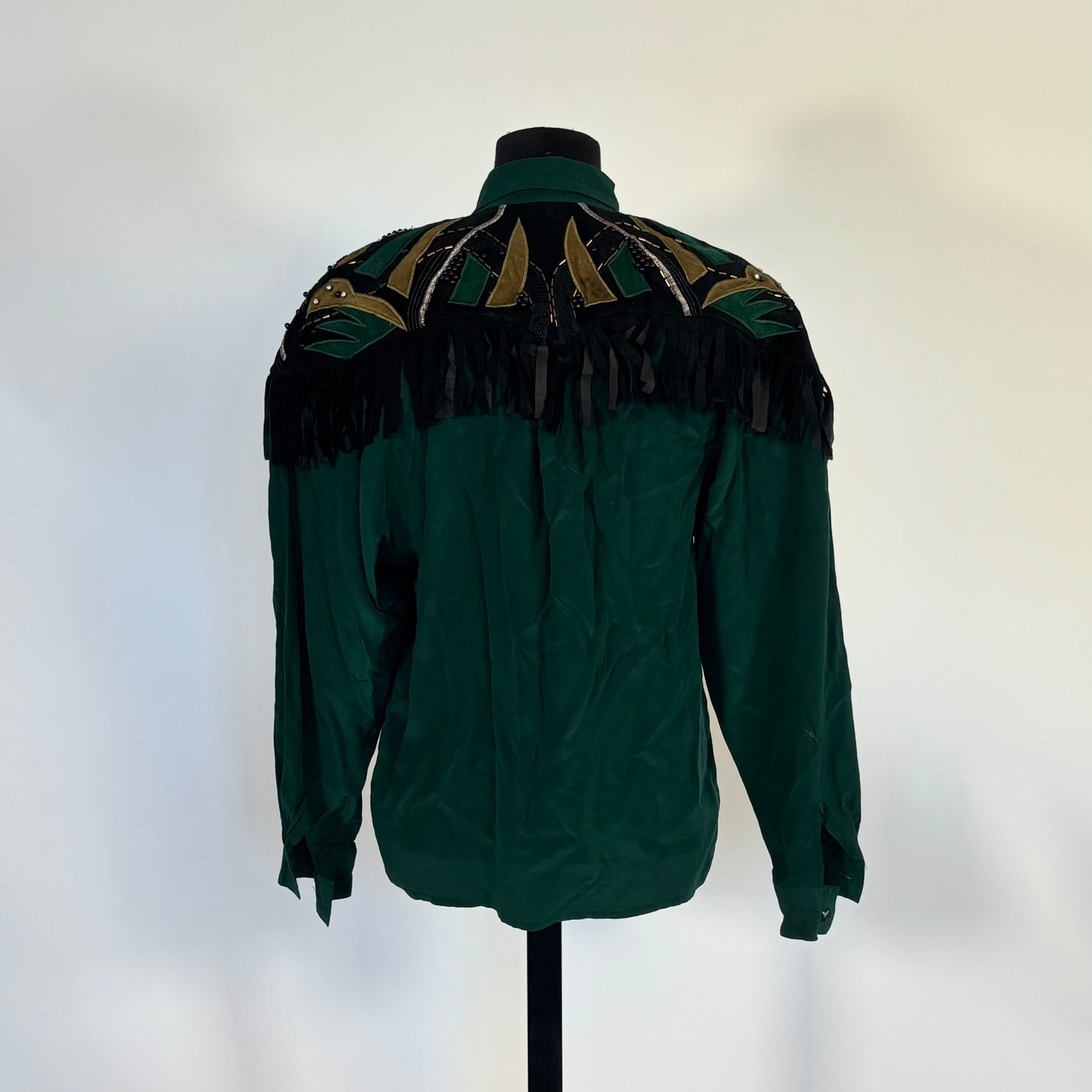 Vintage Cedars 100% Green Silk Western Button Down Top. The top has no size/ brand tag, but would best fit a size large. The chest measures 18”. It is made of non-stretch material and has padded shoulders and fringe and rhinestone details.