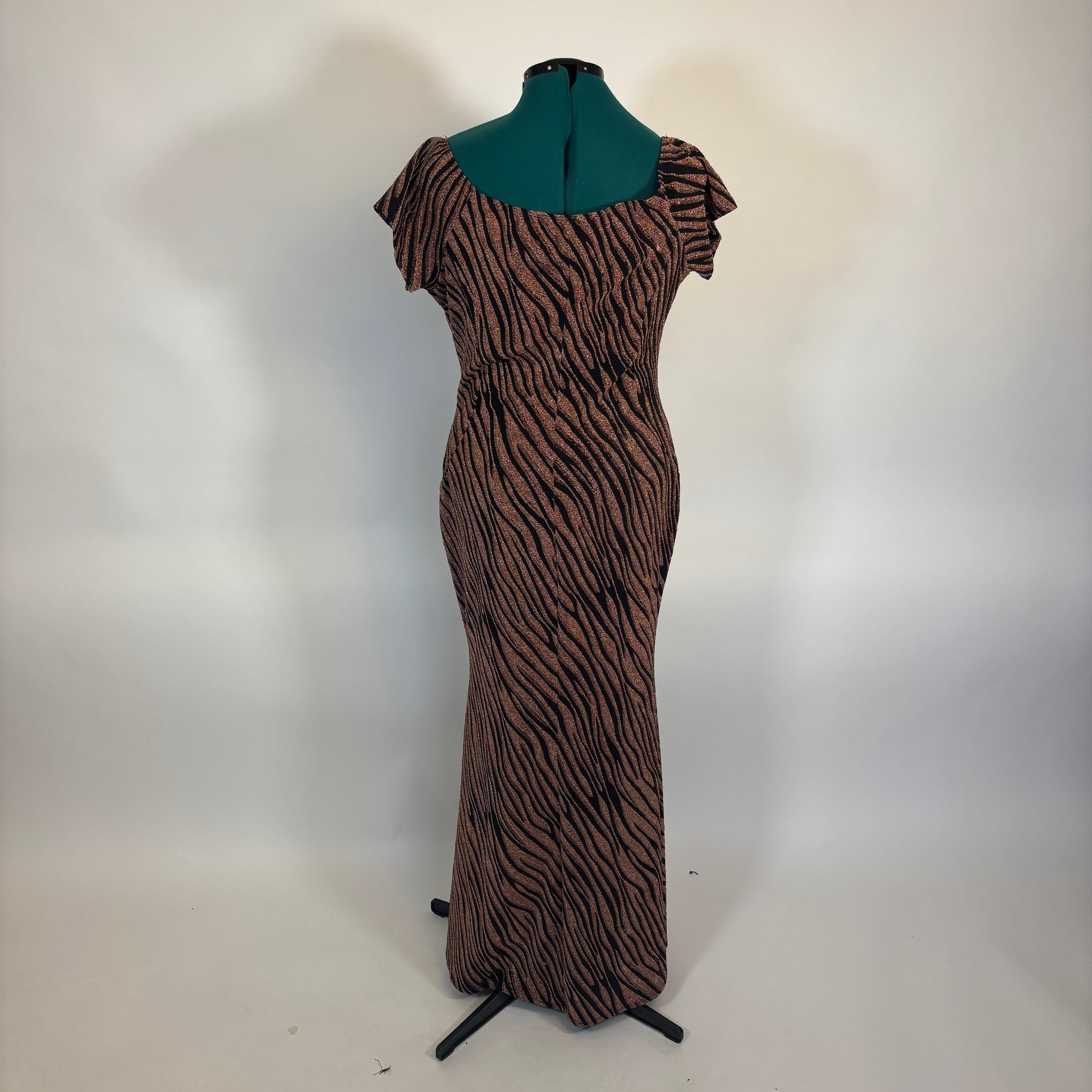 Vintage Inspired Tiger Print Metallic Dress in a size 3X. The dress is a bronzy metallic tinsel thread and black tiger print, the material has a super high stretch. It is intended to hit just above the floor and has a slit in the enter seam on the front.